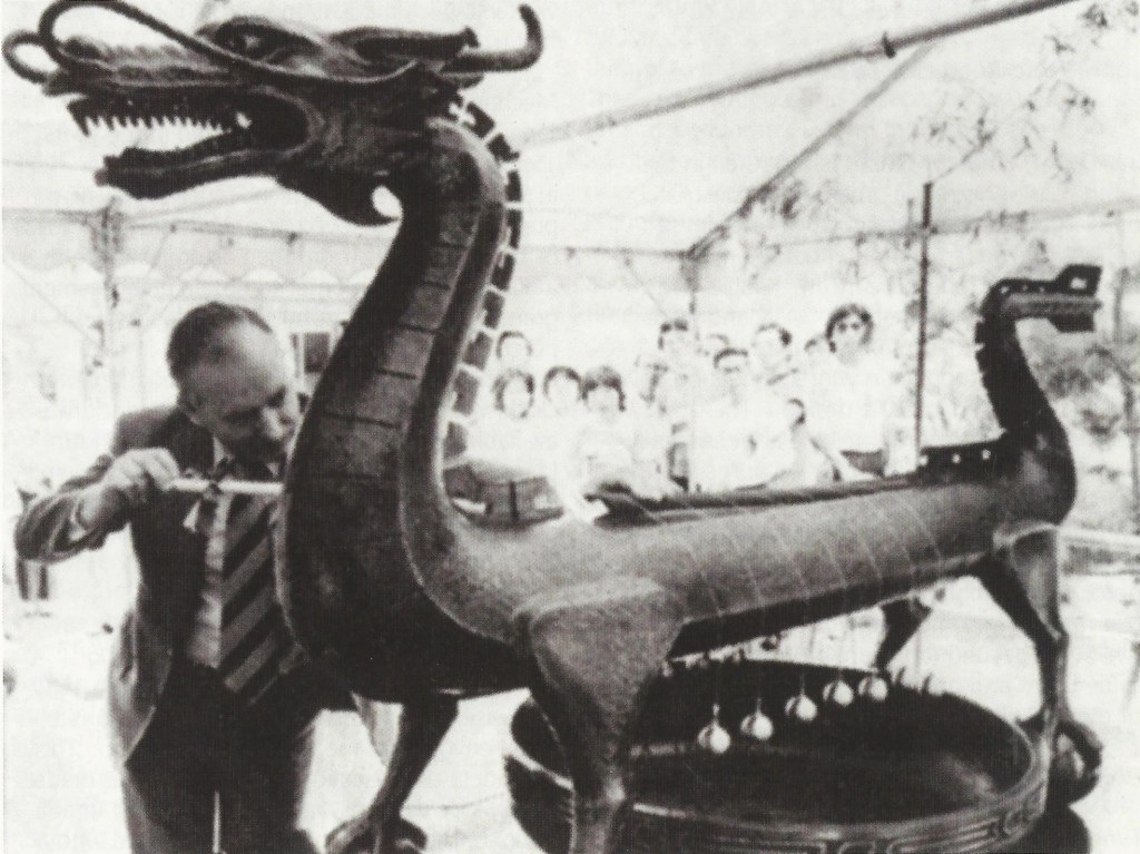 The dragon boat rested upon two pedestals. A metal pan or basin having a high resonance was placed between the pedestals on a flat surface. The “clock” consisted of a pair of small bronze bells tied to the terminals of 13 silk threads. The threads were draped over the incense stick at intervals corresponding to the rate of burning of the incense trail and the Temporal Hours of the Japanese day.
