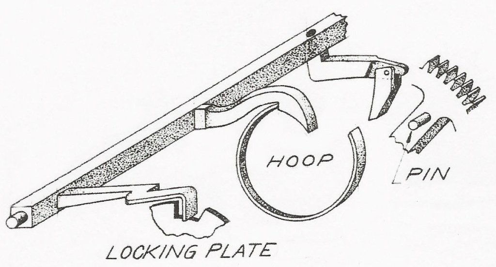 There are two other peculiarities; the fly, usually four bladed, has no slip but is pushed onto a squared arbor; and there is no heart-shaped cam for lifting the release out of engagement; instead there is a hoop wheel similar to those found in English lantern clocks and the inclined part of the locking arm is extended to give the required lift. The lifting pins for the hammer are on the great wheel whose arbor carries the pinion of report for driving the locking-plate. As in the European clocks of the period, the hammer is moved through an intermediate crank in the same plane as the bottom of the bell. About the only time the direct hammer action is found is in some but not all of the iron clocks.