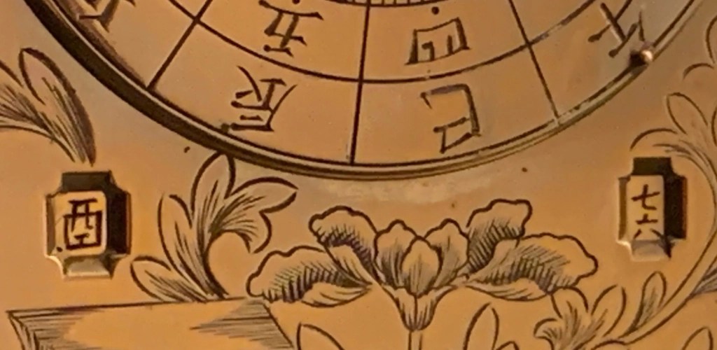Wadokei with Calendars were first seen from around 1700. This date is only a few years after the government controlled reforms of 1685. Whilst the 12 lunar months of long and short months were used in daily life in Japan, Wadokei Calendars followed the Buddhist Stems convention. This was a continuation of using the 12 Terrestrial Stems adopted for Wadokei hours. In all probability, this would have been due to the fact that the time of day was rung-out by priests from Buddhist Temples to towns and villages. (This compares with the European Convention of using Roman Numerals for clocks).