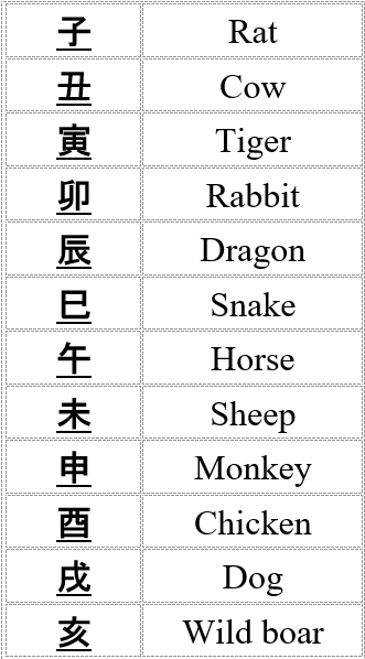 - The x12 Junishi uses the Buddhist 12 Terrestrial Stems of Rat (ne), Ox (ushi), Tiger (tora), Hare (u), Dragon (tatsu), Serpent (mi), Horse (uma), Ram (hitsuji), Monkey (saru), Cock (tori), Dog (inu) and Boar (i).