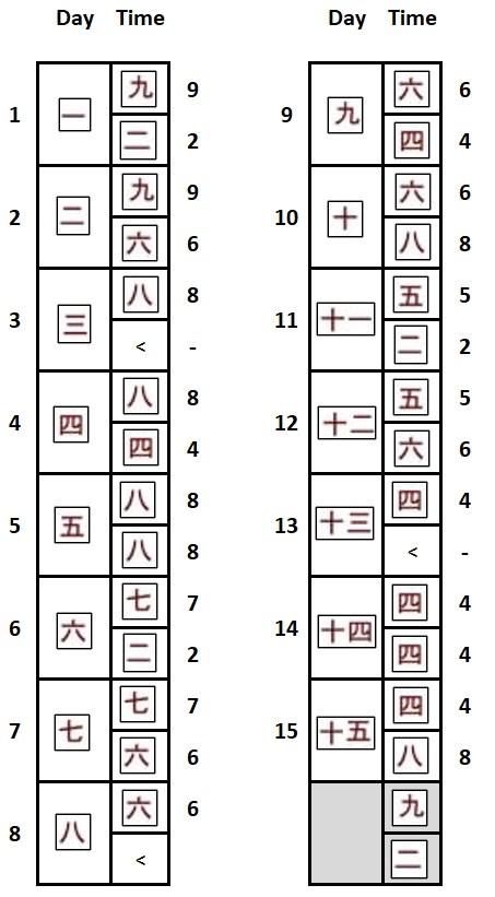 Ancient Chinese Year Calendars were introduced to Japan in the year 553, but it was not until the year 604 that the Japanese officially adopted them. This Calendar was based on the sexagesimal system (base 60) of the Buddhist 5(x2) Celestial Stems combined with the 12 Terrestrial Stems, giving 60-day cycles. There were 6 of these cycles in a year, thus totalling 360 days. Period adjustments had to be made to account for the difference to a true year of 365 ¼ days. The New Year started on the Japanese lunar new year day. This Calendar is still adopted today in some areas of interest, but now starts on 1 January.