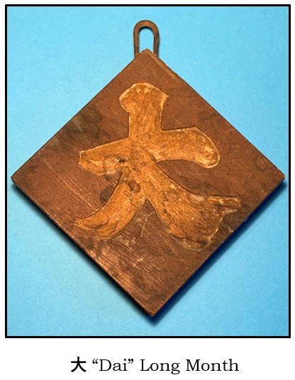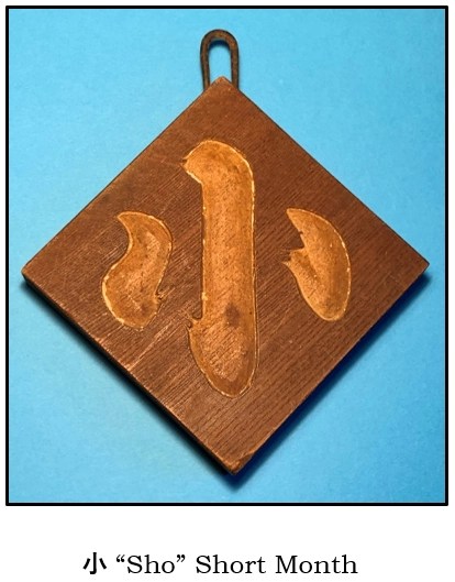 However, over the centuries and throughout the Edo Period, Japan generally adopted the system of 12 lunar months in a year. A lunar month corresponds to just over 29.5 days in the solar calendar. According to the official Japanese lunisolar calendar, each year had a different sequence of twelve either “long” (30 day) or “short” (29 day) lunar months. This had to be adapted about every three years or so with an extra, “intercalary month” (jun) added to synchronise with the seasons. Merchants, who made it a rule to effect payments or collections at the end of each month, would make plaques to show a long or short month and display them in their shops according to the month, to avoid mistakes. I was presented with a gift from Professor Kazuyoshi Suzuki, of the National Museum of Science and Nature, Tokyo, with one of these plaques at our meeting there in 2015 (below). It measures 12 cm x 12cm x 2 cm.